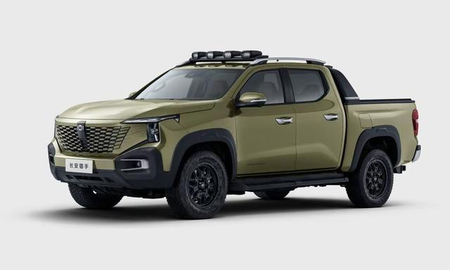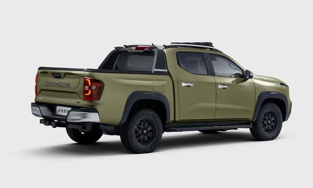 长安猎手K50采用“猎动美学”设计语言,前脸鲨鱼脸造型搭配无边界矩阵格栅,配合“7”字型LED日行灯,视觉冲击力十足。车顶配备4颗前装探照灯(2颗远光+2颗露营灯),夜间照明覆盖范围达200米。车身橄榄绿车漆、全地形AT轮胎、熏黑轮眉及防滚架设计,强化越野属性。货箱标配分段式尾门栏板及2.5吨拖拽能力。(标轴版轴距3180mm,货箱容积达1.6m³;长轴版载重495kg)